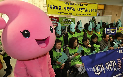 | △ '세계 물의 날' 물 한방울이라도 아껴요 (부산=연합뉴스) 김선호 기자 = 부산여성소비자연합과 부산시상수도사업본부 등은 20일 오후 1시 30분 부산 부산진구 롯데백화점 지하 1층 지하 분수대 앞에서 세계 물의 날(3월 22일)을 기념해 물 아껴쓰기 운동 캠페인을 벌이고 있다. 2015.3.20 wink@yna.co.kr |