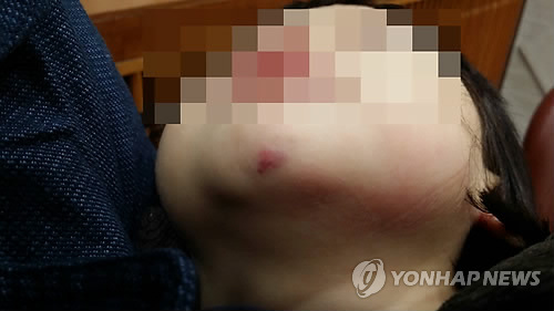 | △ 어린이집에 다녀온 뒤 턱에 멍이 든 3살 여아 (안산=연합뉴스) 경기 안산의 한 어린이집 교사가 3살 여아를 폭행하는 등 학대했다는 주장이 제기돼 경찰이 수사에 나섰다. 어린이집 A(47·여)교사에게 폭행당한 B(3)양의 턱에 멍이 들어있다. B양의 부모는 딸이 A교사에게 맞아 어딘가에 턱을 부딪히면서 멍이 든 것이라고 주장하고 있다. 2015.3.20 <<학부모 제공>> goals@yna.co.kr |