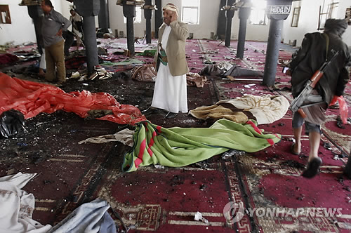 (카이로=연합뉴스) 한상용 특파원 이재영 기자 = 예멘 수도 사나에 있는 모스크(이슬람 사원)에서 20일(현지시간) 연쇄 폭탄 테러가 발생해 최소 137명이 사망했다.