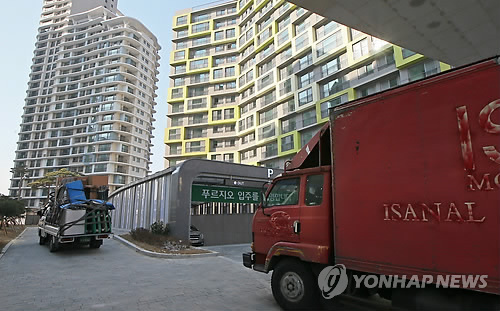 | △ 지난 2월의 주택 준공(입주) 실적은 1.5% 증가한 2만8천732가구였다. 사진은 서울 송파구 장지동 '위례신도시 송파 푸르지오'로 이사대행업체 차량들이 들어가고 있는 모습. |