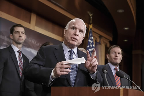 | △ 존 매케인(공화·애리조나) 미 상원 군사위원장이 지난 2월5일(현지시간) 기자회견을 열고 버락 오바마 대통령이 우크라이나에 대한 무기지원 결정을 내리지 않으면 미 의회가 법제화에 나서겠다는 입장을 밝히고 있다. |