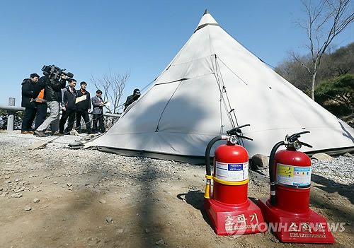 | △ 강화군청·강화소방서 관내 캠핑장 텐트 점검 (인천=연합뉴스) 윤태현 기자 = 23일 오후 인천시 강화군의 한 캠핑장에서 강화군청 공무원들과 강화소방서 대원들이 텐트와 소방시설 등을 점검하고 있다. |