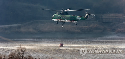 | △ 서부전선 DMZ 산불 (파주=연합뉴스) 임병식 기자 = 23일 오후 경기도 파주시 임진각 인근 임진강에서 소방헬기가 강물을 담고 있다. |