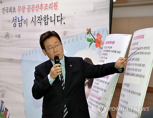 (성남=연합뉴스) 이우성 기자 = '무상 교복' '무상 산후조리' 등 무상복지 확대에 나선 이재명 경기 성남시장이 최근 무상급식 예산 지원을 중단하고 그 예산을 서민 자녀 교육지원 사업에 사용하겠다고 밝힌 홍준표 경남도지사에게 공개 토론을 제안했다.