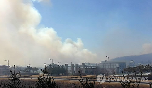 | △ 도라전망대 인근 DMZ 화재 (파주=연합뉴스) 23일 오후 경기도 파주시 장단면 도라전망대 인근 비무장지대(DMZ)에서 불이 나 연기가 피어오르고 있다. 2015.3.23 <<독자제공>> suki@yna.co.kr |