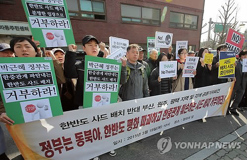 | △ 사드 한반도 배치 반대 기자회견 (서울=연합뉴스) 이정훈 기자 = 전쟁반대평화실현국민행동과 사드 배치 후보지로 거론되는 평택·부산·원주 시민·사회단체 관계자들이 19일 서울 종로구 청운효자동주민센터 앞에서 미국의 고고도미사일방어체계인 사드(THAAD)의 한반도 배치를 반대하는 기자회견을 하고 있다. 2015.3.19 uwg806@yna.co.kr |