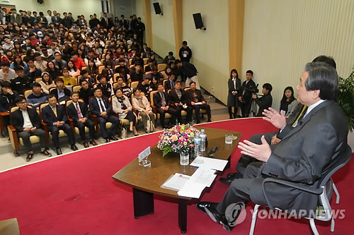 | △ 김무성 대표, 한국해양대서 토크콘서트 (부산=연합뉴스) 차근호 기자 = 김무성 새누리당 대표가 24일 오후 부산 영도구 한국해양대를 방문, 학생과 교수 등이 참석한 가운데 토크콘서트를 갖고 있다. |