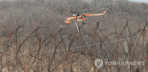 | △ 서부전선 비무장지대(DMZ) 산불 진화 (파주=연합뉴스) 임병식 기자 = 24일 오전 경기도 파주시 도라전망대 인근 임진강에서 소방 헬기가 물을 담아 이동하고 있다. 지난 23일 오전 군사분계선(MDL) 북방 600m 지점에서 산불이 시작돼 강한 북서풍을 타고 남측 DMZ로 번졌다. 2015.3.24 andphotodo@yna.co.kr |