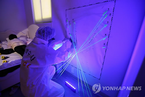 | △ 혈흔 감식하는 CSI 요원 (전주=연합뉴스) 김진방 기자 = 25일 전북지방경찰청에 문을 연 'CSI 실습장'에서 과학수사대 요원이 혈흔 감식을 하고 있다. CSI 실습장은 전북경찰청에 전국 최초로 설치됐으며, 이 곳에서는 CSI 요원 교육과 청소년들의 체험학습 등이 진행될 예정이다. 2015.3.25 chinakim@yna.co.kr |
