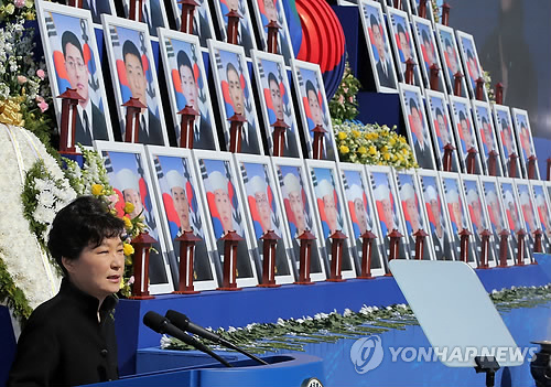 그러면서 박 대통령은 "올해는 우리 민족이 조국을 되찾은 지 70년이 되는 해이고, 동시에 조국의 허리가 끊어진 채 분단된 지 70년을 맞는 해"라며 "남북한 주민 모두가 행복한 통일 조국을 이루는 것이야말로 순국선열들께서 간절히 바라시는 일일 것이고, 천안함 용사들의 희생을 헛되지 않게 하는 길일 것"이라고 밝혔다.