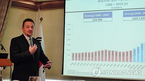 알키에르 장관은 이날 외국인직접투자(FDI) 유치 현황 등 볼리비아의 경제 상황을 설명하고 "10년 전 인구의 40%였던 극빈층이 18%로 감소했다"고 소개했다.