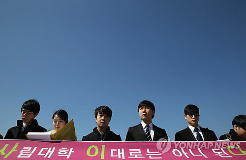 | △ '사립대학 이대로는 아니 된다' (서울=연합뉴스) 이지은 기자 = 서울 사립대학교 총학생회장과 부회장들이 13일 오후 서울 여의도 국회 앞에서 기자회견을 열고 등록금심의위원회의 정상화를 요구하고 일방적인 학사제도 변경을 규탄하고 있다. 건국대, 경희대, 고려대, 국민대, 서강대, 세종대, 숭실대, 연세대, 중앙대, 한양대, 홍익대 등 11개 대학 총학생회는 연석 회의기구인 '사이다(사립대학 이대로는 아니 된다'를 출범했다. 2015.3.13 jieunlee@yna.co.kr |