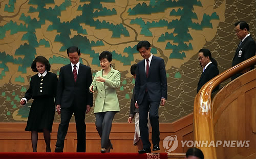 | △ 신임 대사들과 환담장 향하는 박 대통령 (서울=연합뉴스) 도광환 기자 = 박근혜 대통령이 27일 오후 청와대에서 열린 대사 신임장 수여식에서 수여식을 마친 뒤 김장수 주중 대사(왼쪽), 모철민 주프랑스 대사(오른쪽) 등과 환담장으로 향하고 있다. |