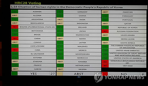 유엔 인권이사회는 제28차 회기 마지막 날인 이날 스위스 제네바에서 유럽연합(EU)과 일본이 제출한 이런 내용의 북한 인권결의안을 찬성 27, 반대 6, 기권 14표로 채택했다.