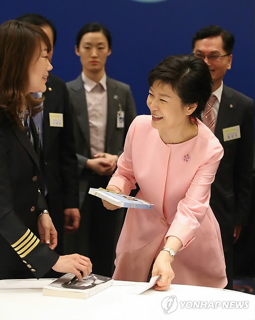 | △ 지난 2013년 박근혜 대통령이 중국 국빈방문 중에 박 대통령 자서전인 '절망은 나를 단련시키고 희망은 나를 움직인다'에 사인요청을 받고 미소를 짓고 있다. (연합뉴스 자료사진) |