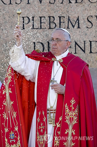| △ (AP=연합뉴스) 프란치스코 교황이 29일(현지시간) 바티칸 성베드로 광장에서 성지주일 미사 중 성수를 뿌리고 있다. 교황은 이날 미사 중 저먼윙스 여객기 추락사고 희생자들을 위해 기도했다. Pope Francis asperges holy water as he celebrates a Palm Sunday Mass in St. Peter's Square, at the Vatican, Sunday, March 29, 2015. Pope Francis has walked solemnly through St. Peter's Square in a Palm Sunday procession to usher in Holy Week ahead of Easter. Francis clutched a palm frond for the religious service, celebrated outside St. Peter's Basilica. In keeping with the simple tone of his two-year-old papacy, Francis leaned on a plain wooden pastoral staff instead of a traditionally more ornate one as he stood under a red canopy on the basilica steps. (AP Photo/Andrew Medichini) |