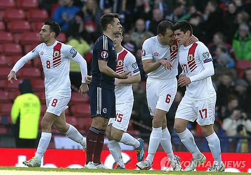 | △ 지브롤터 축구대표팀 선수들이 스코틀랜드를 상대로 득점에 성공한 뒤 기뻐하고 있다.(AP=연합뉴스) |