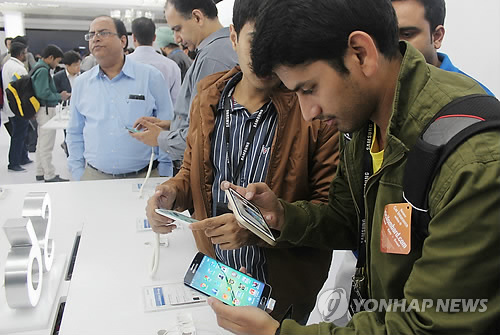 | △ 인도 뉴델리에서 열린 갤럭시S6와 S6엣지 공개행사에서 현지 IT 전문 기자들과 블로거들이 제품을 살펴보고 있다. |
