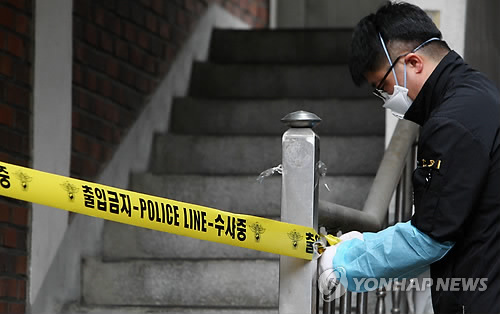 | △ 고1 동생이 고3 친형 살해한 현장 감식 (춘천=연합뉴스) 이재현 기자 = 1일 고교 3학년인 친형을 흉기로 찔러 숨지게 한 혐의로 고교 1학년생인 동생이 경찰에 붙잡혔다. 춘천시 후평동의 사건 현장 감식을 위해 경찰 과학수사요원이 폴리스 라인을 설치하고 있다. 2015.4.1 jlee@yna.co.kr |