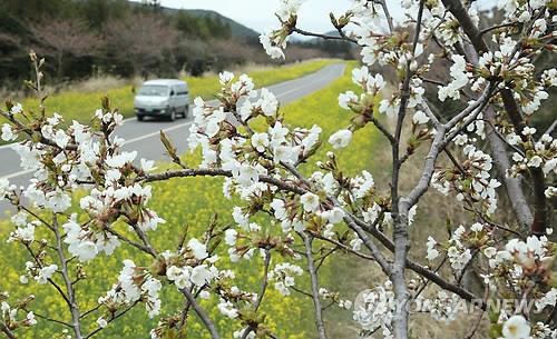 가시리는 마을 진입로인 녹산로 왕복 2차선 10㎞ 구간에 노란 유채꽃과 제주 특산 왕벚꽃이 활짝 펴 그림 같은 드라이브 코스를 자랑하고 있다.