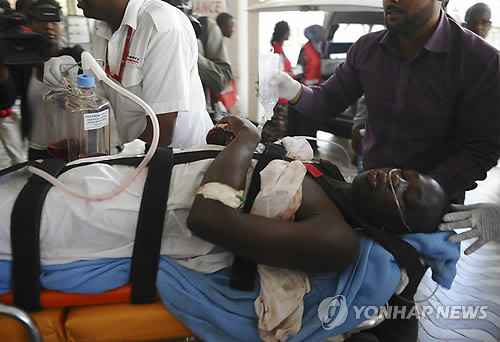 | △ (AP=연합뉴스) 2일(현지시간) 케냐 나이로비의 케냐타 국립병원에서 의료진들이 가리사 대학서 발생한 총격사건에 부상을 입은 환자를 돌보고 있다. 이날 소말리아 이슬람 극단주의 무장단체 알샤바브가 케냐 북동부 가리사 대학 캠퍼스에서 무차별 총격을 가해 지금까지 학생들과 경찰, 군인 등 147명이 사망했다. Medics help an injured person at Kenyatta national Hospital in Nairobi, Kenya, Thursday, April , 2, 2015 , after being airlifted from Garissa after an attack by gunmen at Garissa University College in northeastern Kenya on Thursday morning. Al-Shabab gunmen attacked Garissa University College in northeast Kenya early Thursday, targeting Christians and killing at least 15 people and wounding 60 others, witnesses said. (AP Photo) |