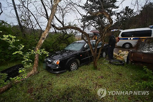 | △ 남녀 4명 숨진 채 발견된 승용차 (경주=연합뉴스) 지난 4일 오후 5시께 경북 경주시 감포읍 감나무 밭 주변 야산으로 연결되는 농로에 세워진 승용차 안에서 4명이 숨진 채 발견돼 경찰이 조사를 벌이고 있다. 사진은 발견된 승용차. 2015.4.5 haru@yna.co.kr |