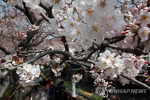 | △ 진해 여좌천 벚꽃 개화 (창원=연합뉴스) 이정훈 기자 = 진해 군항제 개막을 사흘 앞둔 29일 경남 창원시 진해구의 대표적인 벚꽃 군락지인 여좌동 여좌천 일대 벚꽃들이 하나둘씩 개화하기 시작했다.상춘객들이 활짝 핀 벚꽃 아래를 걷고 있다. 28~29일 사이 개화한 진해지역 벚꽃은 4월 4~5일 사이 절정에 이를 것으로 예상된다. 2015.3.29 seaman@yna.co.kr |