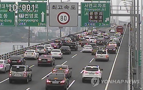 | △ 영화처럼 광안대교에서 돈 뿌려 (부산=연합뉴스) 5일 오후 부산 광안대교 상판에서 영화의 한 장면처럼 달리는 차량에서 1달러 짜리 지폐 200여 장을 도로에 뿌려 뒤따르던 차량들이 멈춰서면서 한 때 교통정체 현상이 발생했다. (부산경찰청 CCTV 캡처) |