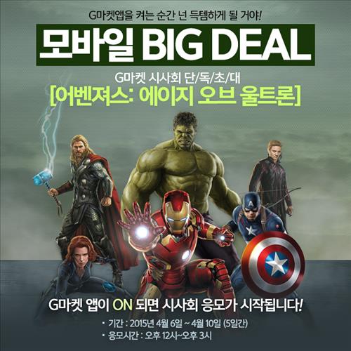 이 기간에 '어벤져스2' 시사회 초청 이벤트도 열린다. 매일 정오부터 오후 3시 사이 G마켓 모바일앱에 접속하면 응모할 수 있다. 매일 일괄추첨을 통해 당첨자를 선정하는데 모두 3천200명에게 시사회 티켓(1인 2매)을 증정한다.