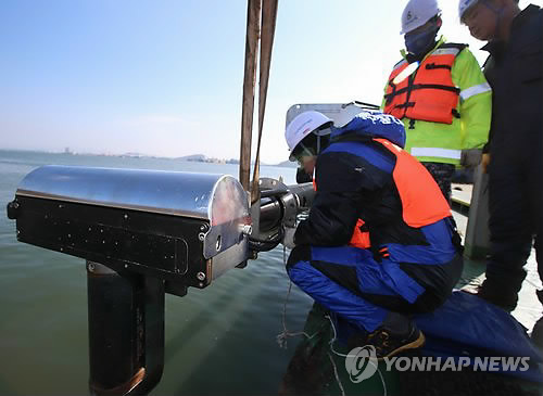 | △ 지난 1월 전남 목포 삼학부두에 정박 중인 현대 보령호에서 한국해양과학기술원 관계자들이 세월호 선체 인양 여부 2단계 조사에 투입될 멀티빔에코사운더(다중빔음향측심기)를 고강도 수직센서거치대에 설치하고 있다.(연합뉴스 자료사진) |
