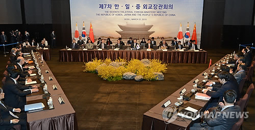 | △ 지난달 21일 오후 서울 중구 신라호텔에서 윤병세 외교부장관, 왕이 중국 외교부장, 기시다 후미오 일본 외무상 등이 참석한 가운데 제7차 한중일 3국 외교장관회의가 진행되고 있다. |