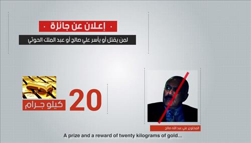 (두바이=연합뉴스) 강훈상 특파원 = 예멘 알카에다 아라비아반도지부(AQAP)는 8일(현지시간) 시아파 반군 후티의 지도자 압둘 말리크 알후티와 2012년 퇴출된 독재자 알리 압둘라 살레 전 대통령을 잡거나 죽이면 금을 주겠다고 밝혔다.