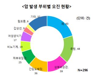 유형별로는 폐암 오진이 60건(20.3%)으로 가장 많았고, 유방암(48건·16.2%)과 소화기암인 상부위장관암(39건·13.2%), 간담도췌장암(36건·12.2%) 등이 그 뒤를 이었다.