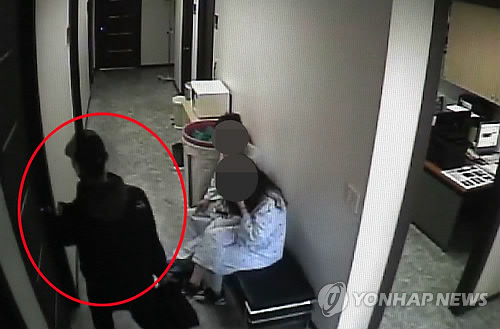 | △ 병실에 들어가는 용의자 (성남=연합뉴스) 9일 오후 3시 35분께 성남시 중원구 6층짜리 상가건물 4층 정형외과에서 방화로 추정되는 불이 나 9명이 부상했다. 부상자 가운데 입원 중이던 A(50)씨와 방문객 B(45)씨 등 2명이 전신에 3도 화상을 입고 인근 병원으로 옮겨져 치료를 받고 있으나 중태다. 경찰은 병원 내 CCTV 영상을 분석한 결과 이날 B씨가 A씨가 있는 병실에 들어간 뒤 30초 후 '펑'하는 폭발음과 함께 불이 발생한 점을 미뤄 B씨가 인화성 물질을 뿌리고 불을 질렀을 것으로 보고 수사를 하고 있다. (연합뉴스TV) |