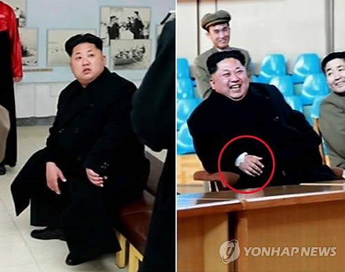 | △ 북한 김정은, 오른 손목에 부상…거즈와 반창고 붙여 (서울=연합뉴스) 북한 조선중앙TV가 8일 전한 김정은 제1위원장의 평양약전기계공장 현지지도 사진(우측)과 달리 4일 전한 제164군부대 시찰 사진(좌측)에는 손목에 거즈와 반창고가 붙어 있지 않아 손목 부상은 최근에 입은 것으로 보인다. 2015.4.9 nkphoto@yna.co.kr |