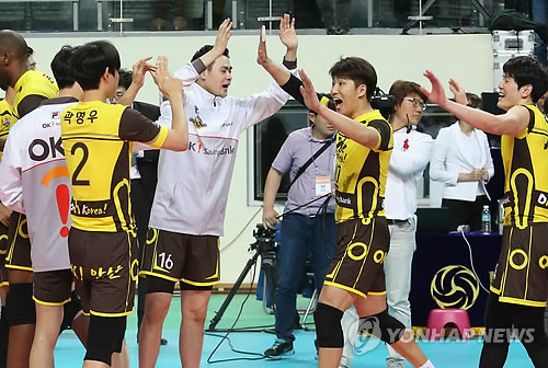 | △ '우리가 최강' (서울=연합뉴스) 서명곤 기자 = 12일 오후 서울 중구 장충동 장충체육관에서 열린 '2015 IBK기업은행 한·일 V리그 톱매치' 남자부 OK저축은행과 일본 JT 선더스의 경기에서 세트스코어 3-2로 승리한 OK저축은행 선수들이 기뻐하고 있다. 2015.4.12 seephoto@yna.co.kr |