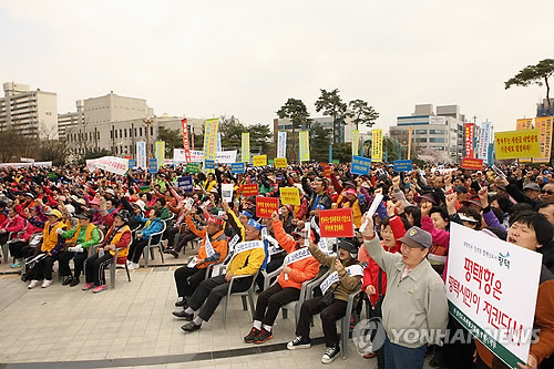 | △ '평택항 되찾기 범시민운동본부'는 지난 8일 평택시민 2천명이 모인 가운데 시청앞 분수공원에서 평택항 신생매립지의 평택시 귀속을 촉구하는 결의대회를 열었다. (연합뉴스 자료사진) |