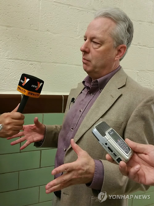 | △ 미 비영리단체 CNA의 켄 고스 국제관계국장 (워싱턴=연합뉴스) 김세진 특파원 = 북한 권력체제를 주로 연구해 온 미국 비영리단체 해군분석센터(CNA)의 켄 고스 국제관계국장이 13일(현지시간) 미국 버지니아 주 알렉산드리아에서 강연한 뒤 연합뉴스·연합뉴스TV 기자와 만나 북한 정권이 1~2년 안에 공고화되지 못한다면 2~5년 안에 김정은 북한 국방위원회 제1위원장이 권력에서 밀려나는 등의 큰 변동이 있을 수 있다고 전망했다. 2015.4.14. smile@yna.co.kr |