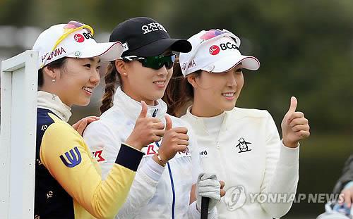 | △ (제주=연합뉴스) 김호천 기자 = 12일 롯데 스카이힐 제주컨트리클럽에서 열린 제8회 롯데마트 여자오픈 마지막 라운드에 출전한 김혜윤·김보경·정재은(이상 왼쪽부터)이 엄지손가락을 세워 보이며 기념촬영을 하고 있다. 2015.4.12 |