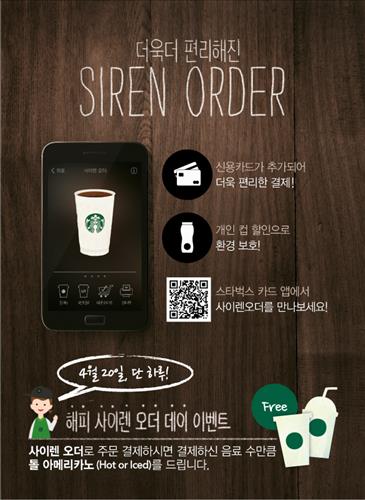 사이렌 오더는 스타벅스 카드 모바일 앱으로 음료를 선택해 결제할 수 있는 서비스다. 주문 대기 시간을 줄일 수 있어 지난해 5월 시작한 이후 10개월 만인 지난달까지 주문 건수가 70만건을 돌파했다.