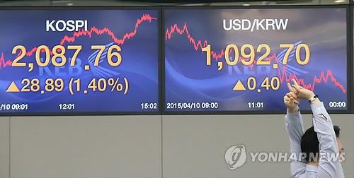 | △ 코스피 기지개 (서울=연합뉴스) 서명곤 기자 = 코스피지수가 전날보다 28.89포인트(1.40%) 오른 2,087.76으로 거래를 마감한 10일 오후 서울 중구 명동 외환은행 본점 딜링룸에서 한 딜러가 기지개를 켜고 있다. 이날 지수는 종가 기준으로 2011년 8월 2일(2,121.27) 이후 가장 높은 수준이다. 코스닥지수는 전날보다 5.06포인트(0.75%) 오른 682.02로 마감했다. 지수가 680선을 넘어선 것은 2008년 1월 14일 이후 처음이다. 2015.4.10 seephoto@yna.co.kr |