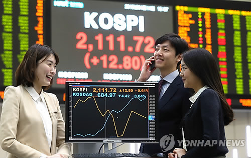 | △ 2,100선 탈환한 코스피 (서울=연합뉴스) 이지은 기자 = 코스피가 2,100선을 돌파한 14일 오후 서울 여의도 한국거래소에서 직원들이 환한 표정을 짓고 있다. 코스피가 2,100선을 넘은 것은 지난 2011년 8월 2일 장중 고점 2,155.44 이후 처음이다. |