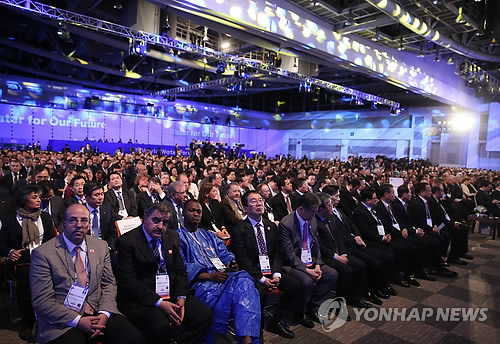 | △ 제7차 세계 물포럼 개회식 (대구=연합뉴스) 도광환 기자 = 박근혜 대통령이 참석한 가운데 12일 오후 대구 엑스코에서 제7차 세계물포럼 개회식이 열리고 있다. 2015.4.12 dohh@yna.co.kr |