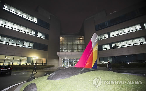 | △ 아시아나기 히로시마공항 활주로 이탈 (서울=연합뉴스) 윤동진 기자 = 14일 아시아나항공 여객기가 일본 히로시마(廣島) 공항에 착륙하면서 활주로를 벗어나는 사고가 발생, 23명이 부상했다고 교도통신이 보도했다. 사진은 이날 오후 서울 강서구 아시아나항공 본사 앞. 2015.4.14 mon@yna.co.kr |