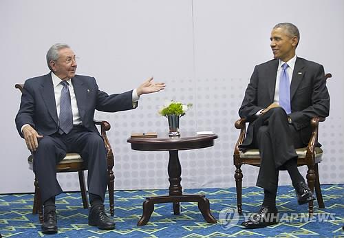 | △ 미국 정부가 14일(현지시간) 쿠바를 '테러지원국' 명단에서 제외하기로 했다. 사진은 지난 11일 파나마의 수도 파나마시티에서 열린 미주기구(OSA) 정상회의에서 역사적인 회�을 한 버락 오바마 미국 대통령과 라울 카스트로 쿠바 국가평의회 의장. 2015.4.15 (AP=연합뉴스) |