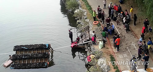 | △ 울산 태화강서 뒤집힌 뗏목 (울산=연합뉴스) 이상현 기자 = 3일 오후 울산 태화강에서 유람용 뗏목이 뒤집혀 16명이 다쳤다. 뒤집힌 뗏목 주변에서 수색작업이 벌이지고 있고 구조된 사람 몇몇이 강변에 쓰러져 있다. 2013.11.3 <<기사 참조. 시민 제공>> leeyoo@yna.co.kr |