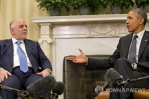 | △ 이라크 총리, 백악관 방문 (AP=연합뉴스) 미국을 방문중인 하이다르 알-아바디 이라크 총리(왼쪽)가 14일(현지시간) 워싱턴DC의 백악관에서 버락 오바마 대통령과 대화하고 있다. bulls@yna.co.kr |