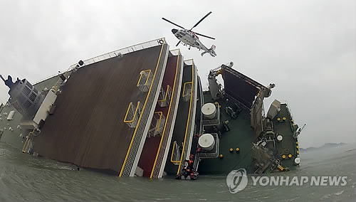 | △ 전남도 어업지도선이 사고 이후 공개한 세월호 침몰 당시 승객들의 구조장면. 기울어진 세월호로 구조헬기와 보트가 접근하고 있다. 영상은 전남도 어업지도선 201호에 딸린 단정 항해사 박승기 씨의 헬멧에 부착된 카메라로 촬영됐다. 2014.4.29 <<연합뉴스 DB>> |
