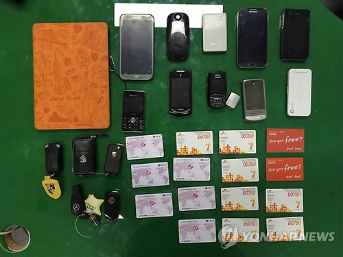 | △ 유명 로펌 로비스트팀장 사칭 50대 투자 사기범 구속 (성남=연합뉴스) 재력가를 사칭해 투자금 명목으로 17억여원을 받아 가로챈 50대 사기범이 경찰에 붙잡혔다. 사진은 피의자 최모(50)씨가 범행 당시 사용한 외제차 스마트키와 대포폰, 휴대전화 선불카드. 2015.4.5 <<분당서 제공>> young86@yna.co.kr |