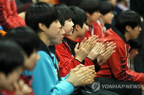 | △ 동료 응원하는 안산 단원고 탁구부원들 (전주=연합뉴스) 최영수 기자 = 세월호 참사의 아픔을 지닌 안산 단원고의 탁구부원들이 16일 오후 전주시 화산체육관에서 열린 전국남녀종별선수권대회 여고 단체전 준결승 경기에서 동료 선수들을 응원하고 있다. 2015.4.16 kan@yna.co.kr |